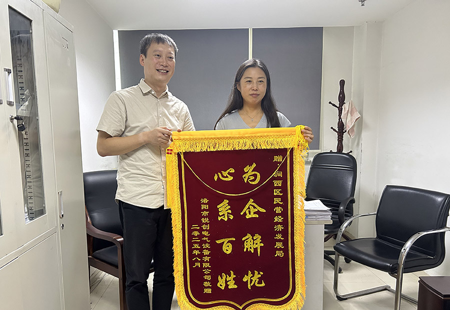 9月2日上午,銳創(chuàng)電氣負(fù)責(zé)人陳總前去瀛洲街道辦事處和澗西區(qū)民營(yíng)經(jīng)濟(jì)發(fā)展局送去錦旗和一批愛(ài)心水果,感謝政府主動(dòng)作為、高效協(xié)調(diào),幫助企業(yè)解決外地職工子女入學(xué)難題。